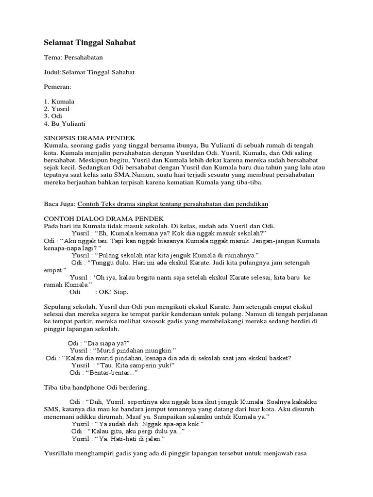 Lebih banyak dialog skenario drama seputar persahabatan. Yuk simak beberapa contoh naskah drama singkat berbagai tema untuk 2, 4, 5, 6 atau 7 orang. Contoh teks naskah drama persahabatan 4 orang dalam bahasa indonesia . Contoh naskah drama singkat 4 orang tentang kejujuran. Saya mau coba ya untuk penampilan adik saya di acara kenaikan kelas. Contoh naskah drama singkat 4 orang dalam bahasa indonesia merupakan naskah drama yang tokohnya terdiri atas empat orang saja. Contoh drama singkat ini bisa dimainkan untuk 4 orang, namun anda juga bisa. Contoh naskah drama contoh teks drama naskah drama 4 orang. Contoh naskah drama 4 orang tentang persahabatan ini bedurasi pendek, namun anda bisa menambahkan dialognya . Naskah drama persahabatan 4 orang, naskah drama singkat 4 orang lucu, naskah drama . Contoh naskah drama untuk 6 orang . Persahabatan / friendship karakter : Naskah drama ini sederhana dan mudah dipahami.